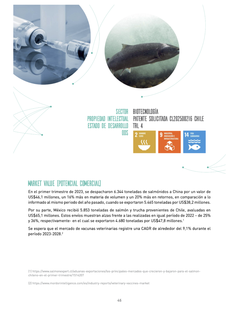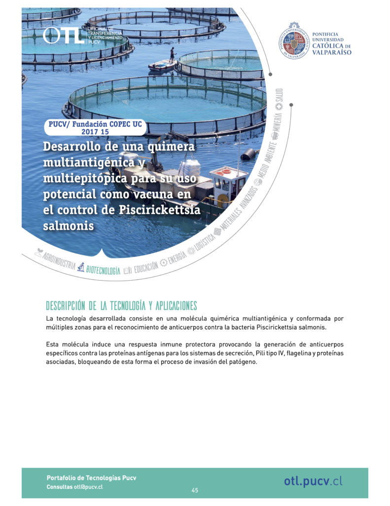 La tecnología desarrollada consiste en una molécula quimérica multiantigénica y conformada por múltiples zonas para el reconocimiento de anticuerpos contra la bacteria Piscirickettsia salmonis.
