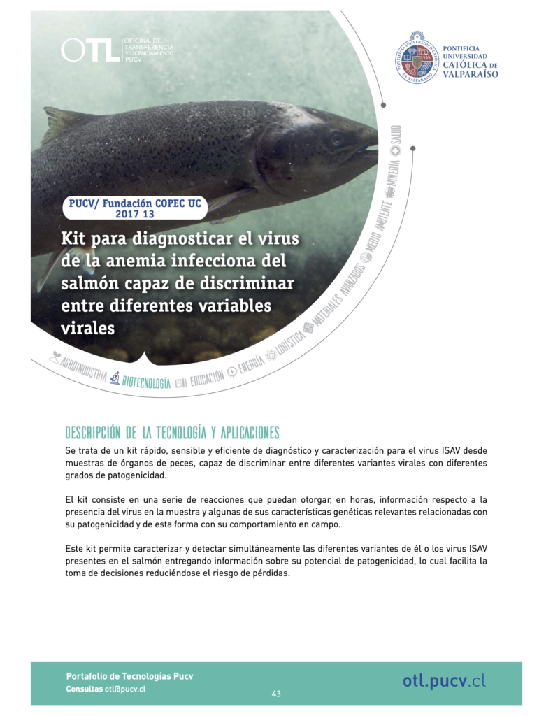 Se trata de un kit rápido, sensible y eficiente de diagnóstico y caracterización para el virus ISAV desde muestras de órganos de peces, capaz de discriminar entre diferentes variantes virales con diferentes grados de patogenicidad.