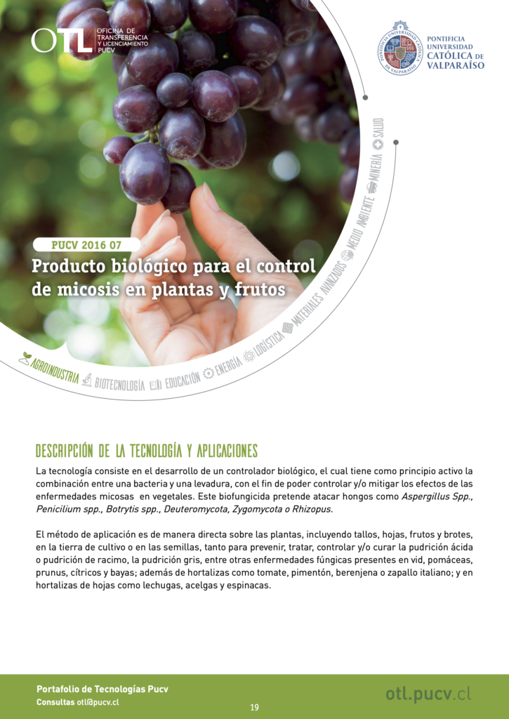 La tecnología consiste en el desarrollo de un controlador biológico, el cual tiene como principio activo la combinación entre una bacteria y una levadura, con el fin de poder controlar y/o mitigar los efectos de las enfermedades micosas en vegetales. Este biofungicida pretende atacar hongos como Aspergillus Spp., Penicilium spp., Botrytis spp., Deuteromycota, Zygomycota o Rhizopus.