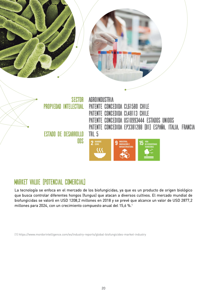 La tecnología se enfoca en el mercado de los biofungicidas, ya que es un producto de origen biológico que busca controlar diferentes hongos (fungus) que atacan a diversos cultivos. El mercado mundial de biofungicidas se valoró en USD 1208,2 millones en 2018 y se prevé que alcance un valor de USD 2877,2 millones para 2024, con un crecimiento compuesto anual del 15,6 % 1